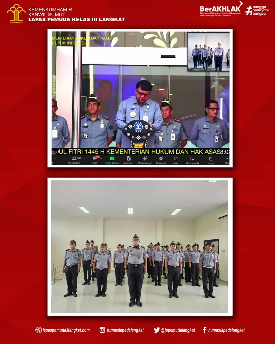 LANGKAT | TURNBACKHOAX.NET – Dalam rangka persiapan Hari Raya Idul Fitri, Lapas Pemuda Langkat mengikuti Apel Kesiapan Pengamanan Hari Raya Idul Fitri 1445 H di Lingkungan Kementerian Hukum dan HAM Republik Indonesia yang diselenggarakan oleh Sekretarian Jendral Hukum dan HAM melalui zoom meeting, Senin (01/04) pukul 07.30 WIB bertempat di aula Lapas Pemuda Langkat.