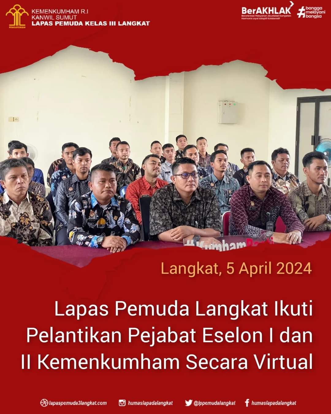 LANGKAT | TURNBACKHOAX.NET – Lapas Pemuda Kelas III Langkat Kanwil Kemenkumham Sumut ikuti kegiatan Pelantikan dan Pengambilan Sumpah Jabatan Pimpinan Tinggi Madya dan Pimpinan Tinggi Pratama di Lingkungan Kemenkumham yang dilaksanakan di Graha Pengayoman melalui zoom meeting, Jumat (05/04).