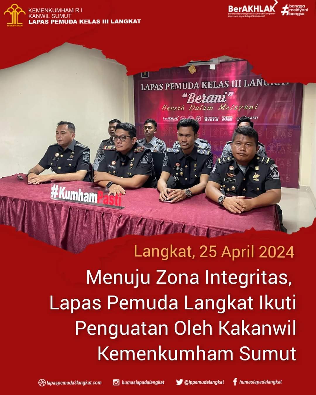 LANGKAT | TURNBACKHOAX.NET -Dalam rangka komitmen bangun Zona Integritas, Lapas Pemuda Langkat ikuti penguatan oleh Kepala Kantor Wilayah Kementerian Hukum dan HAM Sumatera Utara, Agung Krisna bersama 24 Satuan Kerja yang diusulkan meraih predikat Wilayah Bebas dari Korupsi (WBK) Tahun 2024 melalui zoom meeting. Kamis, (25/04).