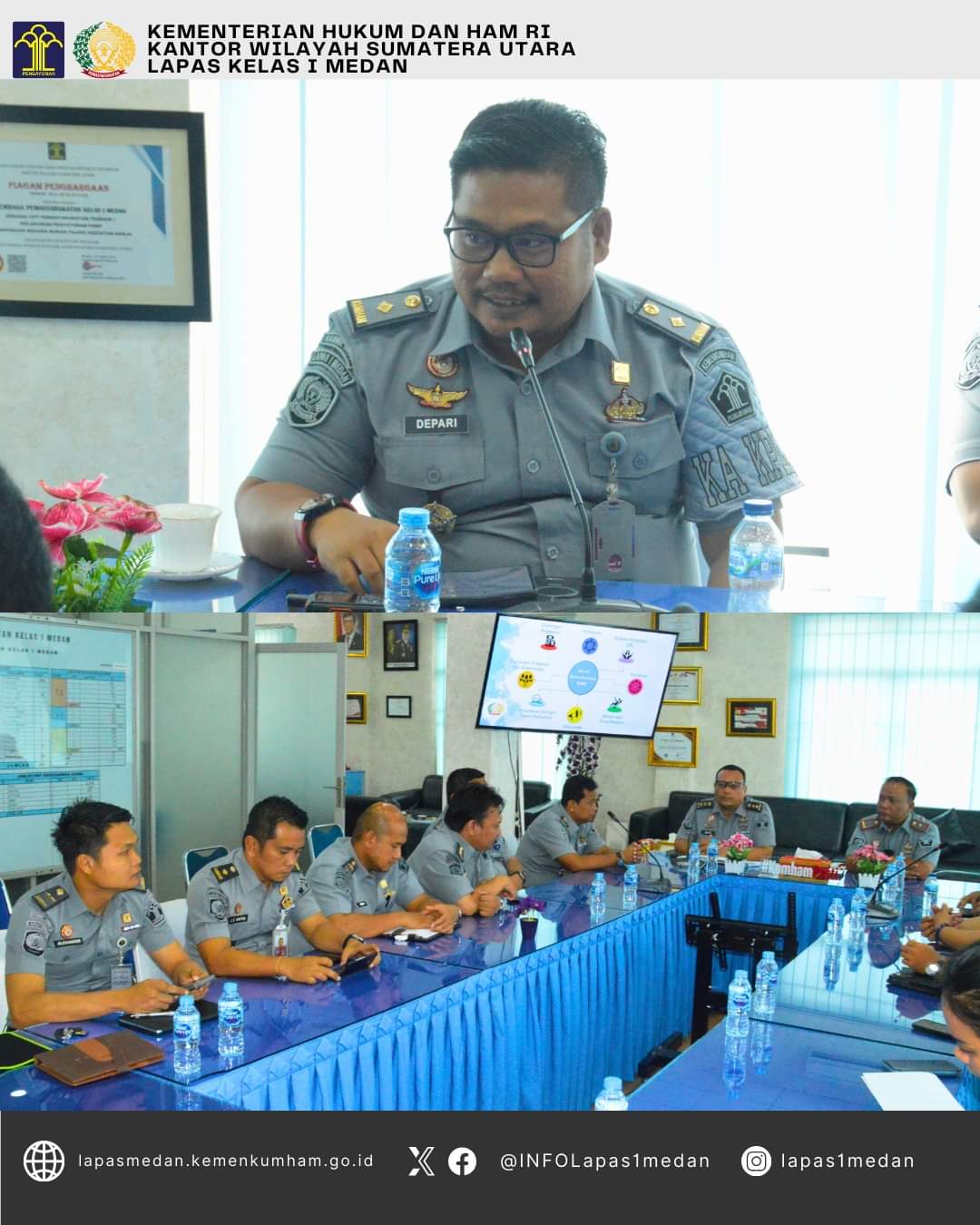 Kepala Lembaga Pemasyarakatan Kelas I Medan, Maju Amintas Siburian, didampingi Ketua Tim RB/PZI, Dat Menda memimpin langsung rapat yang juga dihadiri Tim Pembangunan ZI, Sekretaris, John Erich Ginting, Ketua Pokja Manajemen Perubahan, Eben H. Depari, Ketua Pokja Penata Laksana, Dekki Susanto, Ketua Pokja Penguatan Sistem Management SDM, M. Kurniawan, Pokja Penguatan Akuntabilitas Kerja, Riza Hariady, dan anggota Pokja.