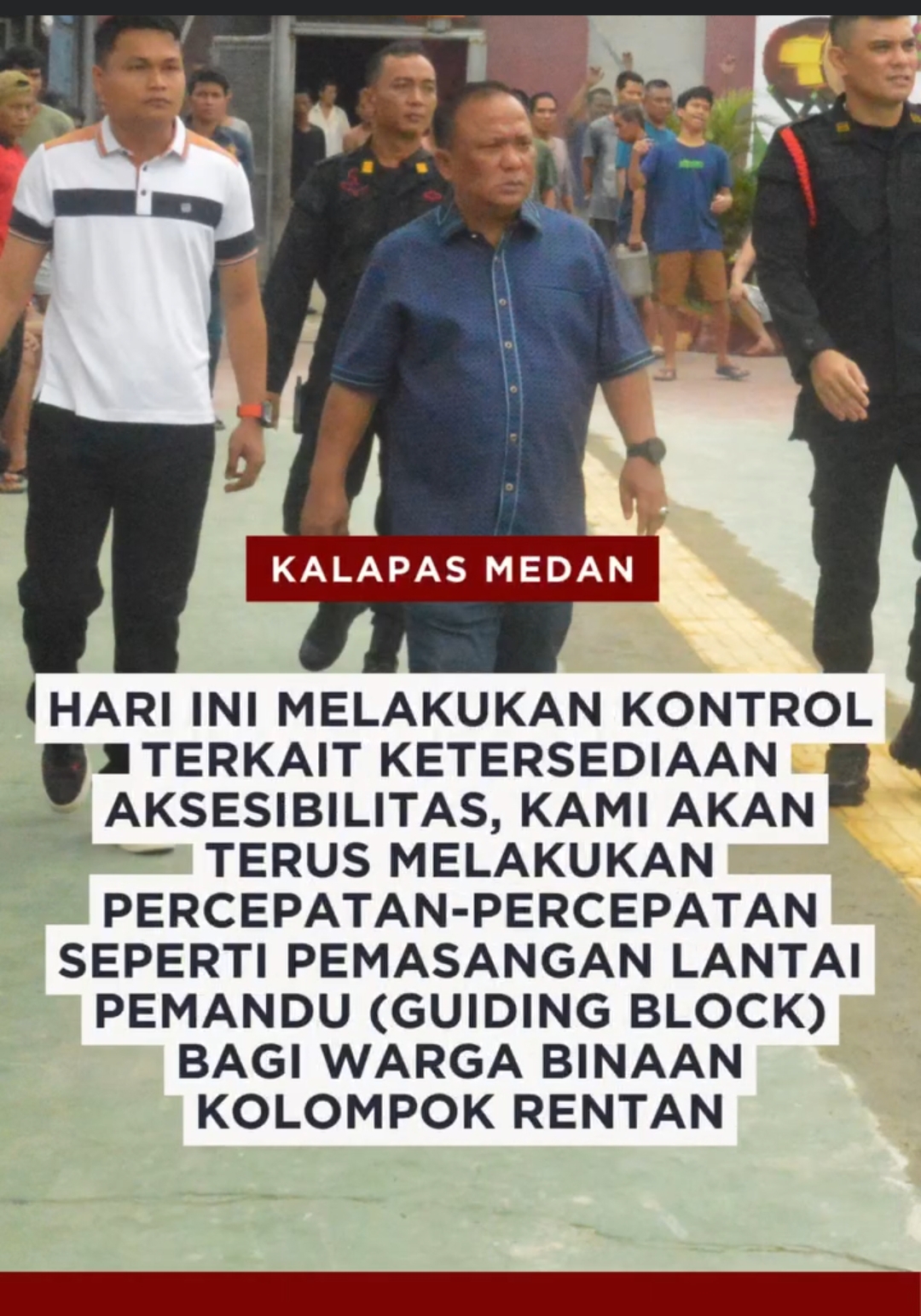 Kalapas Kelas I Medan, Maju Amintas Siburian menyampaikan komitmen dan semangatnya dalam mewujudkan Pembangunan Zona Integritas di Lapas. “Hari ini melakukan kontrol terkait ketersediaan Aksesibilitas, kami akan terus melakukan percepatan-percepatan seperti Pemasangan Lantai Pemandu (guiding block) bagi warga binaan kelompok rentan,” Jelas Maju.
