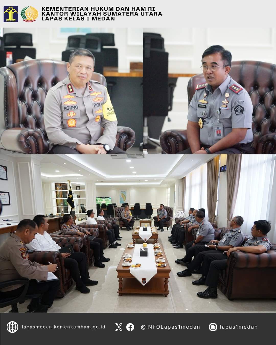 “kami berharap dapat mempererat tali silaturahmi yang selama ini telah terjalin dengan baik. Selain itu saya juga mohon kerja sama serta dukungan pihak kepolisian terkait pelaksanaan tugas dan fungsi Kanwil Kemenkumham Sumut, khususnya dalam hal pengamanan Lembaga Pemasyarakatan (Lapas) dan Rumah Tahanan Negara (Rutan) yang ada di wilayah Sumatera Utara. Hal ini dimaksudkan agar proses pembinaan bagi Warga Binaan dapat berjalan efektif, ucap Agung Krisna.