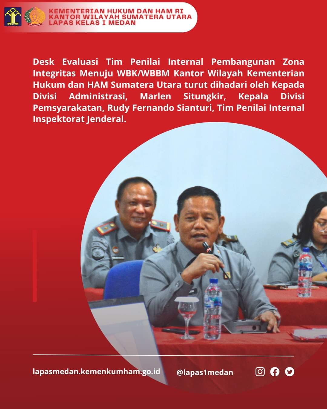 Desk Evaluasi Tim Penilai Internal Pembangunan Zona Integritas Menuju WBK/WBBM Kantor Wilayah Kementerian Hukum dan HAM Sumatera Utara turut dihadiri oleh Kepada Divisi Administrasi, Marlen Situngkir, Kepala Divisi Pemasyarakatan, Rudy Fernando Sianturi, Tim Penilai Internal Inspektorat Jenderal.