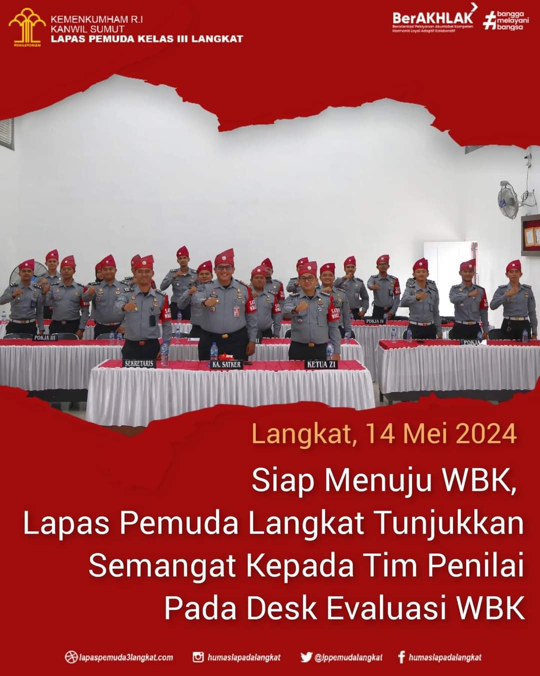 BINJAI|TURNBACKHOAX.NET – Lapas Pemuda Kelas III Langkat Kanwil Kemenkumham Sumut tampil tunjukkan semangat pada kegiatan Desk Evaluasi pembangunan zona integritas bersama dengan Tim Penilai Internal (TPI) Inspektorat Jenderal Kemenkumham yang dipimpin oleh Raden Bagus Wasito, Selasa (14/05). Bertempat di Aula Lapas Kelas IIA Binjai.