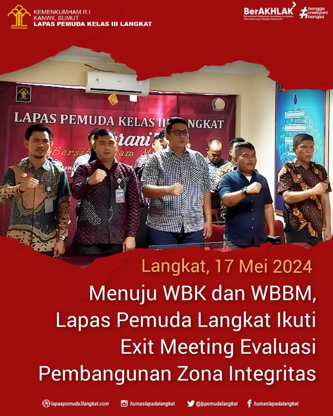 LANGKAT|TURNBACKHOAX.NET – Dalam rangka mematangkan persiapan pembangunan Zona Integritas, Lapas Pemuda Kelas III Langkat Kanwil Kemenkumham Sumut Mengikuti Exit Meeting Evaluasi Pembangunan Zona Integritas Menuju Wilayah Bebas dari Korupsi (WBK) oleh Tim Inspektorat Wilayah V Secara Virtual, Jumat (17/05).