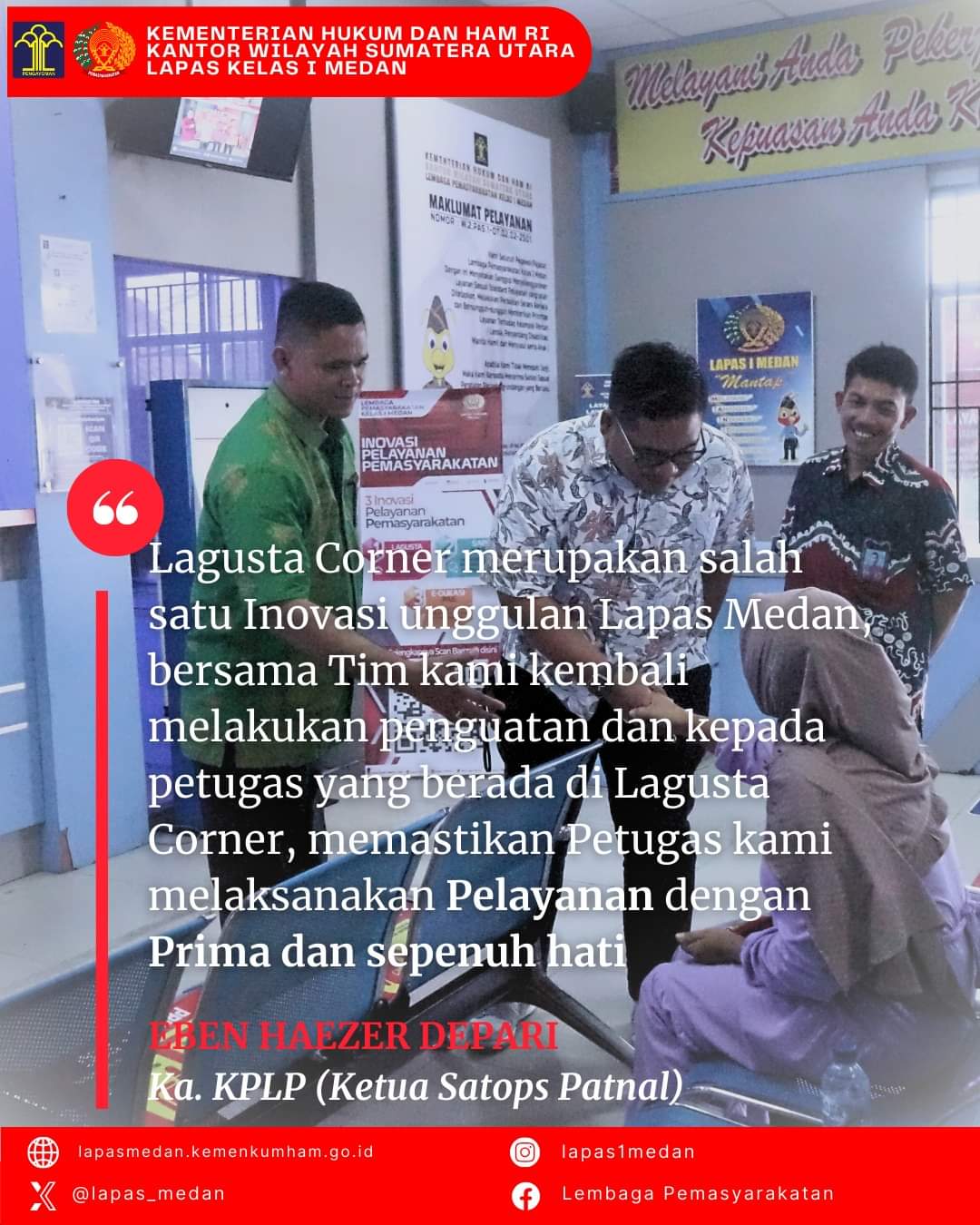 Menurut Eben, selain infrastruktur serta inovasi dari beberapa layanan seperti Lagusta Corner, terus kami kedepankan. “Lagusta Corner merupakan salah satu Inovasi unggulan Lapas Medan, bersama Tim kami kembali melakukan penguatan dan kepada petugas yang berada di Lagusta Corner, memastikan Petugas kami melaksanakan dengan Prima dan sepenuh hati” ungkap Eben.(Red)