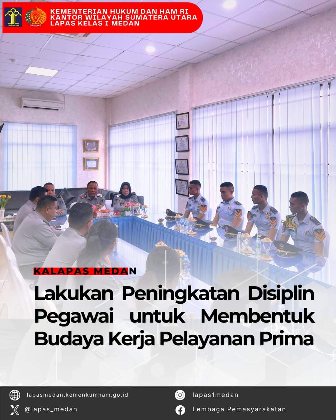 MEDAN|TURNBACKHOAX.NET – Bertempat di Ruang Kerja Kalapas, Selasa Pagi, (11/06/2024) Lembaga Pemasyarakatan melakukan kegiatan meningkatkan disiplin pegawai demi membentuk budaya kerja pelayanan prima yang lebih baik. Kegiatan tersebut dihadiri oleh Kepala Lembaga Pemasyarakatan Kelas I Medan, Maju Amintas Siburian, Kepala Sub Bagian Tata Usaha, Dat Menda, Kabid Pembinaan, Peristiwa Sembiring, Kasi Registrasi Chandra Sudarto, Jajaran Registrasi dan Taruna Poltekip.
