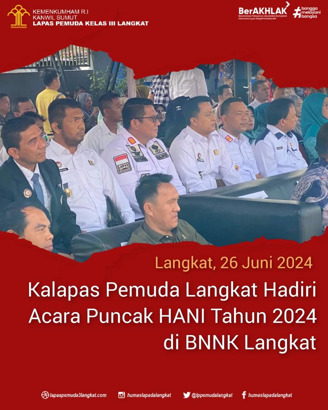 Acara puncak peringatan ini diikuti langsung oleh Pj. Bupati Langkat, Forkopimda Kab.Langkat, Kalapas Pemuda Langkat, Kalapas Narkotika Langkat, Karutan Tanjung Pura, dan Karutan Pangkalan Brandan ikut memeriahkan acara tersebut.