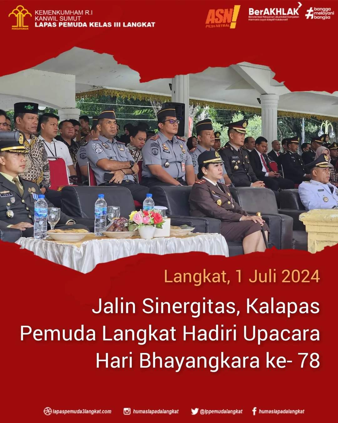 LANGKAT|TURNBACKHOAX.NET – Kalapas Pemuda Kelas III Langkat Kanwil Kemenkumham Sumut, Raymon Andika Girsang ikut memeriahkan Upacara Hari Ulang Tahun Bhayangkara ke-78, Senin (01/07) pukul 08.00 WIB. Bertempat di Lapangan Upacara Alun Alun T.A Hamzah Stabat.