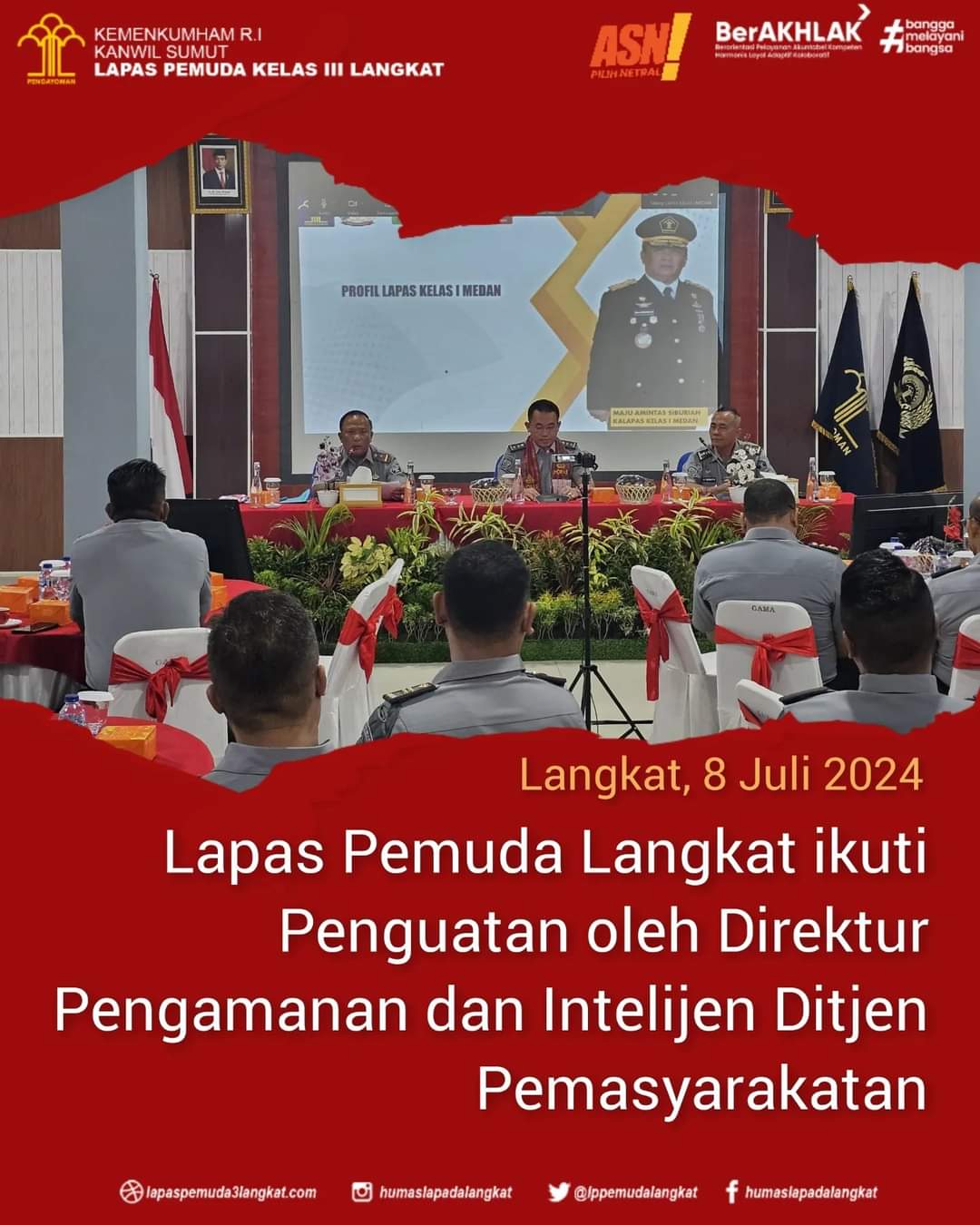 LANGKAT | TURNBACKHOAX.NET – Dalam rangka meningkatkan kompetensi dan ilmu pengamanan dan intelejen, Lapas Pemuda Kelas III Langkat Kanwil Kemenkumham Sumut Ikuti Kegiatan Penguatan Direktur Pengamanan dan Intelijen Ditjen Pemasyarakatan. Kepala Lapas Pemuda Langkat, Raymon Andika Girsang dan Kasubsi Kamtib, Hotler Krisman Pasaribu serta perwakilan Karupam hadir langsung mengikuti di Aula Lapas I Medan, serta Jajaran Lapas Pemuda mengikuti melalui zoom meeting. Senin, (08/07/2024).