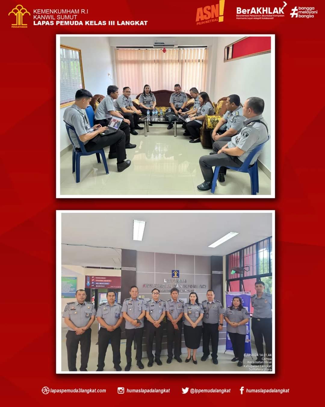 LANGKAT | TURNBACKHOAX.NET -Dalam rangka meningkatkan pelayanan kepada masyarakat, Lapas Pemuda Kelas III Langkat terima kunjungan Monitoring dan Evaluasi Sarpras P2HAM dan Survey IPK dan IKM Kepala Bidang HAM Kanwil Kemenkumham Sumatera Utara, Senin (08/06/2024).