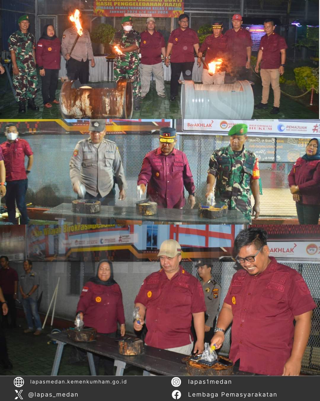 “Lapas Kelas I Medan akan terus berkomitmen bersama jajaran guna mencegah dan meminimalisir terdapatnya barang terlarang yang dapat menyebabkan gangguan kamtib di Lapas,” tegasnya Kalapas, Maju Amintas Siburian saat memimpin kegiatan pemusnahan Hasil razia.