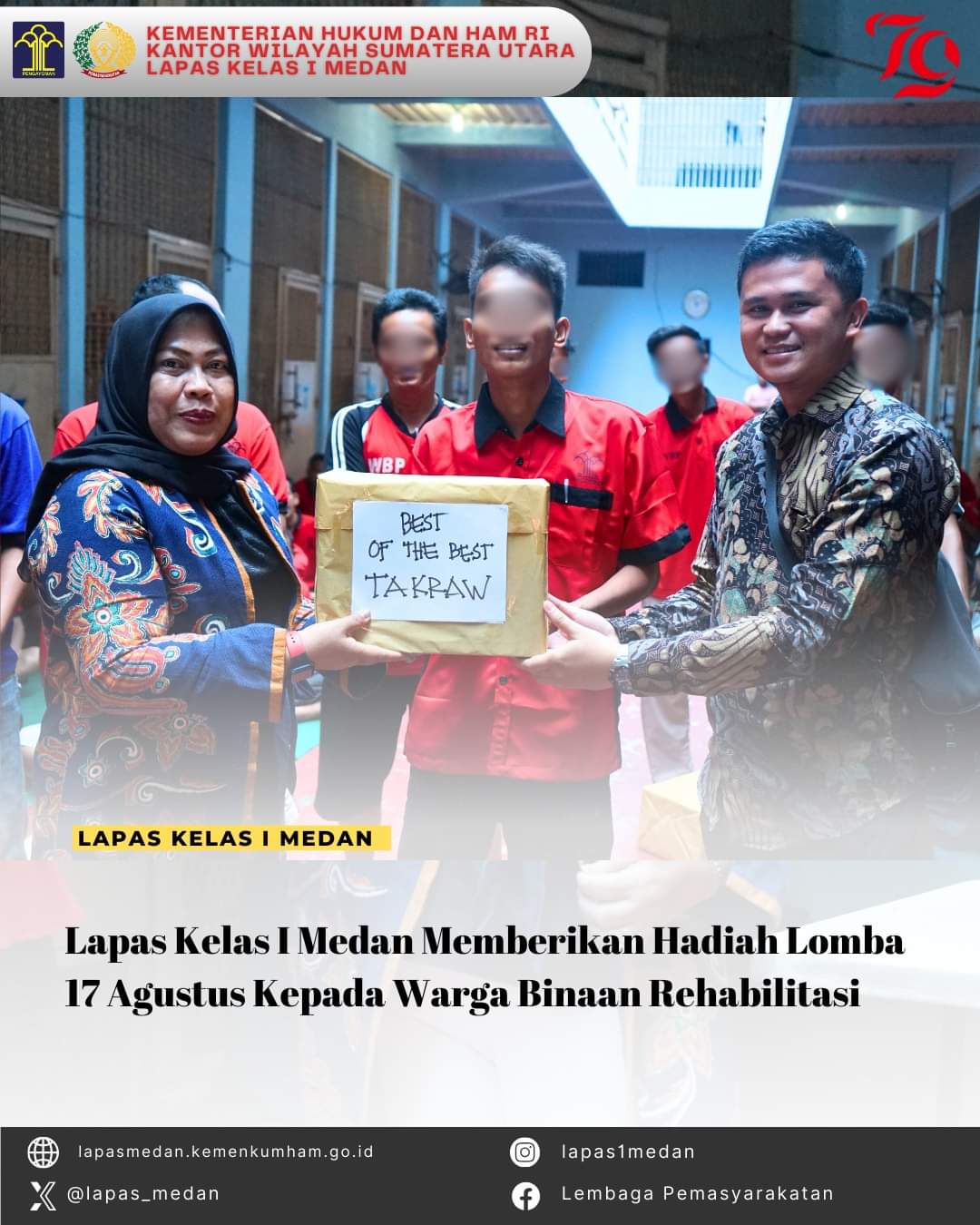 MEDAN|TURNBACKHOAX.NET -Lembaga Pemasyarakatan Kelas I Medan bagikan hadiah kepada para pemenang lomba peringatan Hari Ulang Tahun Ke-79 Republik Indonesia, Jumat (23/8/2024).