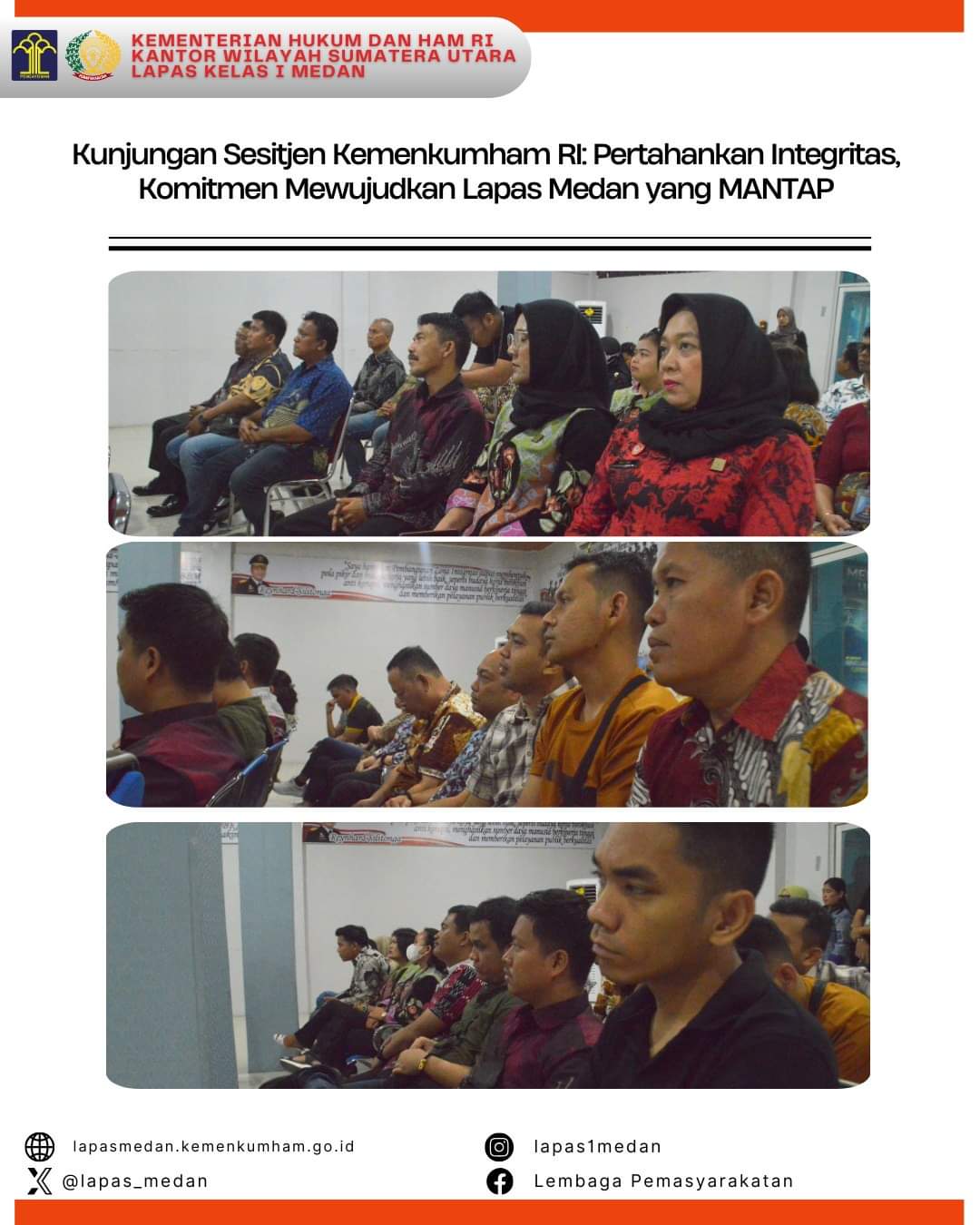 “Saya bangga dan mengapresiasi seluruh pegawai Lapas Medan dimana tidak ditemukannya data pegawai yang memiliki hukuman disiplin. Saya harap prestasi ini terus dipertahankan, kita juga harus bisa memahami regulasi yang ada, beradaptasi dimanapun kita berada agar terciptanya Lapas Medan yang MANTAP (Melayani, Amanah, Nyaman, Transparan, Akuntabel dan Produktif). Saya mengajak seluruh bapak/ibu disini untuk sama-sama bekerja dan bekerjasama, kita semua merupakan orang-orang penting yang memiliki tanggungjawab di bidangnya.” tegasnya.