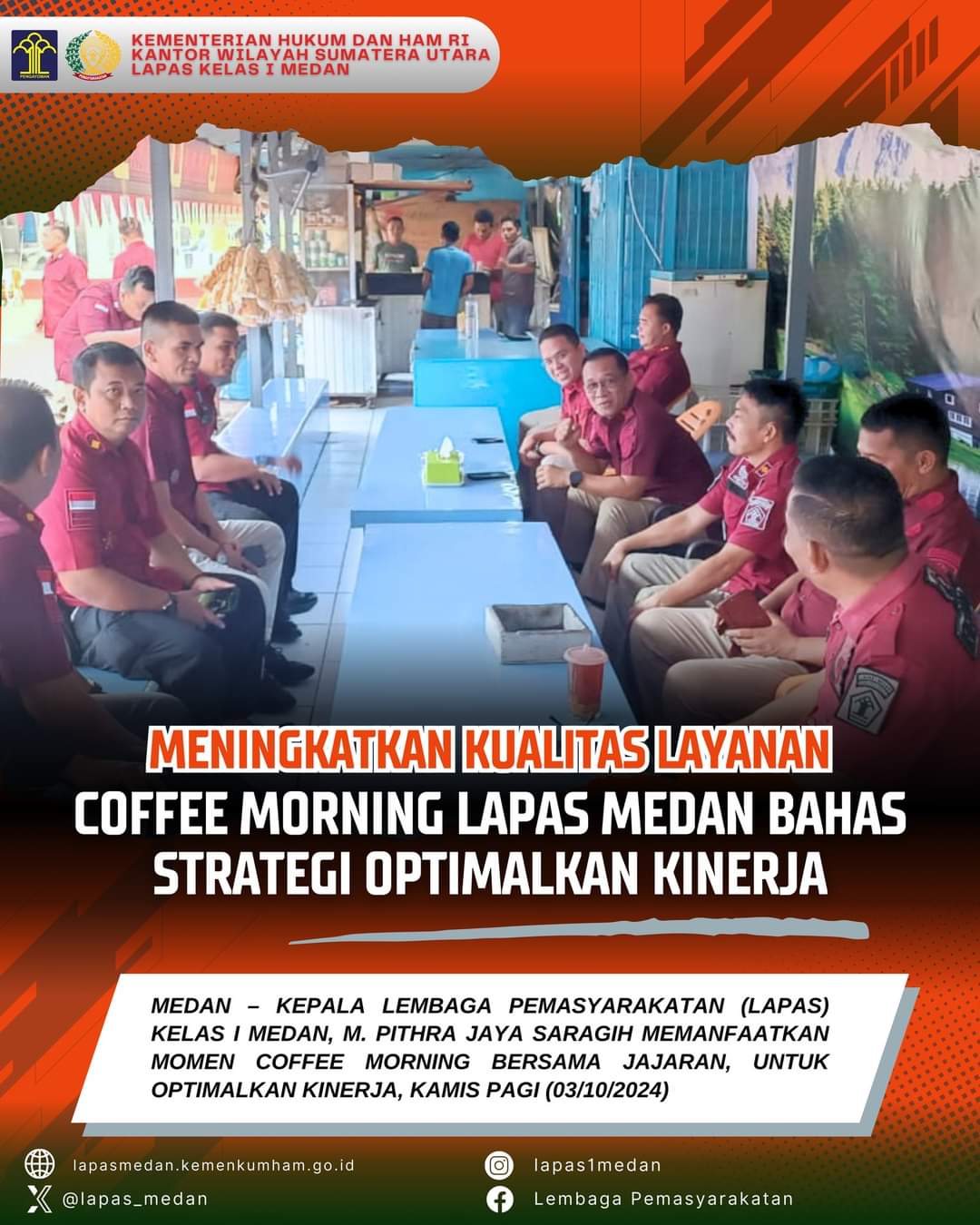 Kalapas Kelas I Medan, M. Pithra Jaya Saragih menyampaikan, momen coffee morning ini menjadi kegiatan yang baik dalam membangun komunikasi dalam pelaksanaan tugas.kamis, (03-10-2024)