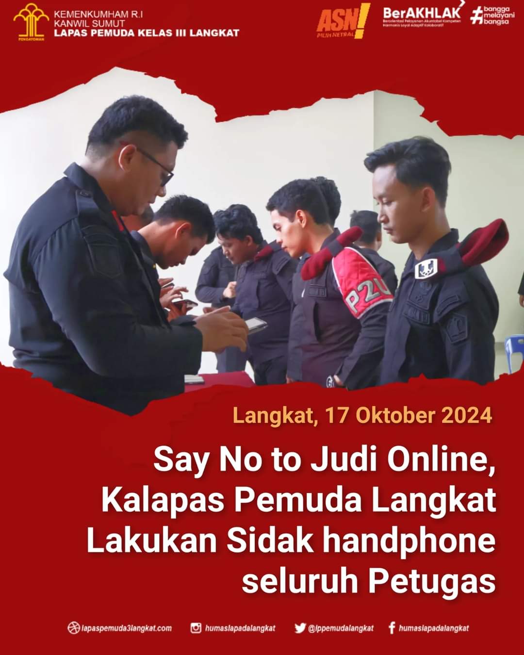 “Saya imbau bagi seluruh jajaran agar sidak HP ini dapat menjadi warning bahwa kami tidak akan pernah mentolerir perbuatan melanggar hukum diantaranya kegiatan perjudian termasuk judi online. Saya ingin memastikan bahwa seluruh petugas Lapas Pemuda Langkat bekerja dengan profesional, berintegritas, dan mematuhi segala peraturan yang berlaku,” tambahnya.