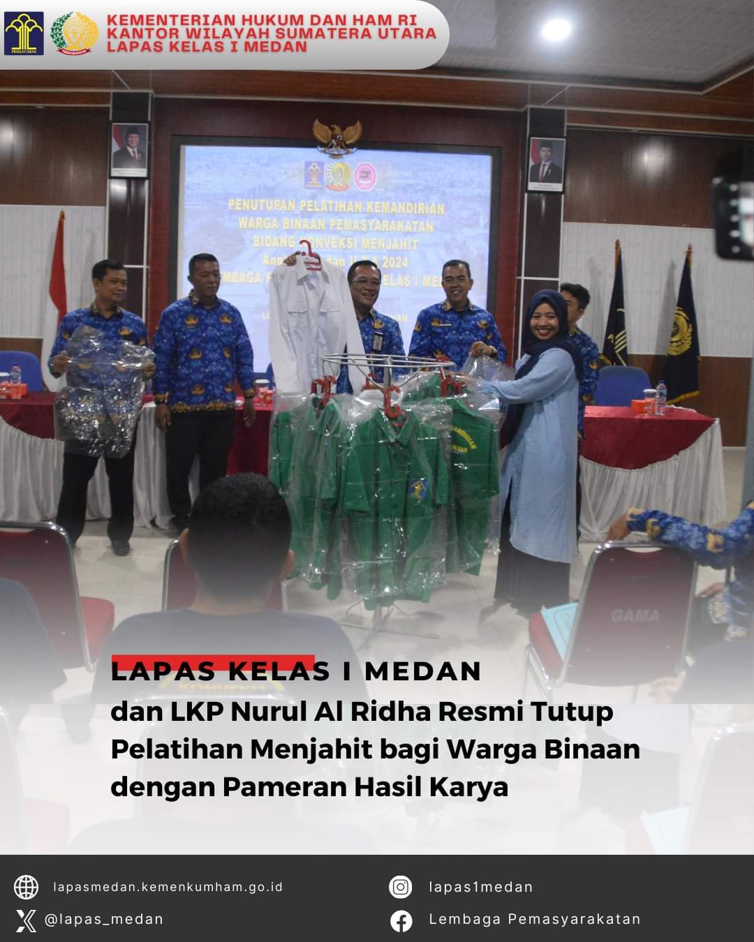 MEDAN|TURNBACKHOAX.NET – Setelah beberapa minggu pelatihan intensif, Lapas Kelas I Medan bersama Lembaga Kursus dan Pelatihan (LKP) Nurul Al Ridha resmi menutup program pelatihan menjahit bagi warga binaan pada Senin (28/10/2024). Acara penutupan ini dihadiri oleh Kepala Lapas, M. Pithra Jaya Saragih, tim pelatih dari LKP Nurul Al Ridha, serta 40 peserta pelatihan. Penutupan juga menampilkan hasil karya menjahit yang telah dihasilkan selama pelatihan, mulai dari pakaian kemeja, kaos hingga aksesori tekstil lainnya, sebagai bukti keberhasilan program pembinaan kemandirian ini.