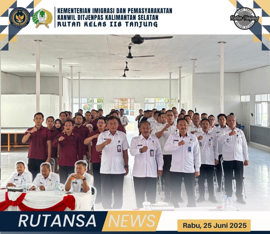 TANJUNG|TURNBACKHOAX.NET – Jajaran Rumah Tahanan Negara (Rutan) Kelas IIB Tanjung ikuti kegiatan penguatan Tugas Pokok dan Fungsi dari Kantor Wilayah Direktorat Jenderal Pemasyarakatan Kalimantan Selatan oleh Kepala Bidang Perawatan, Pengamanan dan Kepatuhan Internal, Isnawan dan Kepala Bidang Pelayanan dan Pembinaan, Sugito. Rabu (25/06/2025).