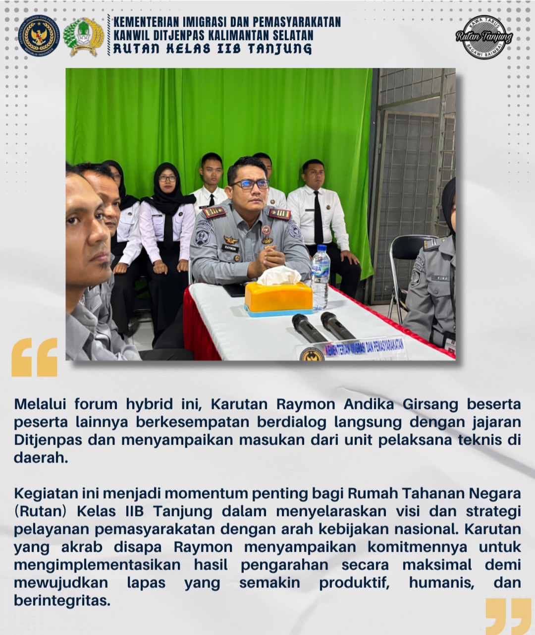 Kegiatan ini menjadi momentum penting bagi Rumah Tahanan Negara (Rutan) Kelas IIB Tanjung dalam menyelaraskan visi dan strategi pelayanan pemasyarakatan dengan arah kebijakan nasional. Karutan yang akrab disapa Raymon menyampaikan komitmennya untuk mengimplementasikan hasil pengarahan secara maksimal demi mewujudkan lapas yang semakin produktif, humanis, dan berintegritas.(Red)