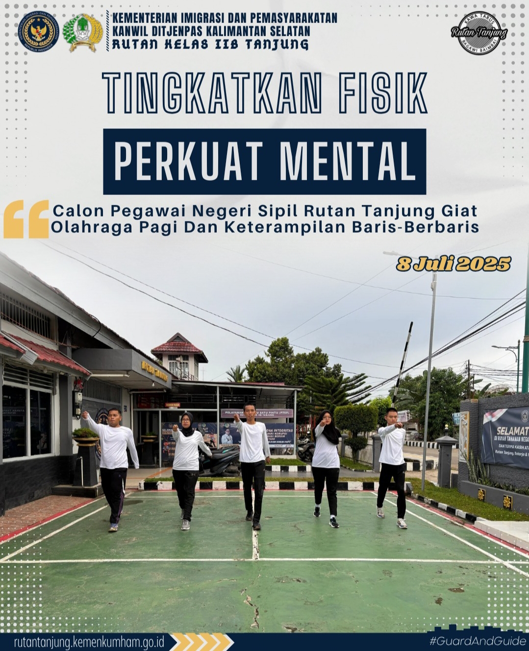 TANJUNG | TURNBACKHOAX.NET – Dalam upaya menumbuhkan fisik dan mental yang kuat, 5 orang Calon Pegawai Negeri Sipil (CPNS) Penjaga Tahanan yang ditempatkan di Rumah Tahanan Negara (Rutan) Kelas IIB Tanjung memulai hari dengan melaksanakan pelatihan fisik dan mental dalam masa orientasi mereka, Senin (08/07/2025).