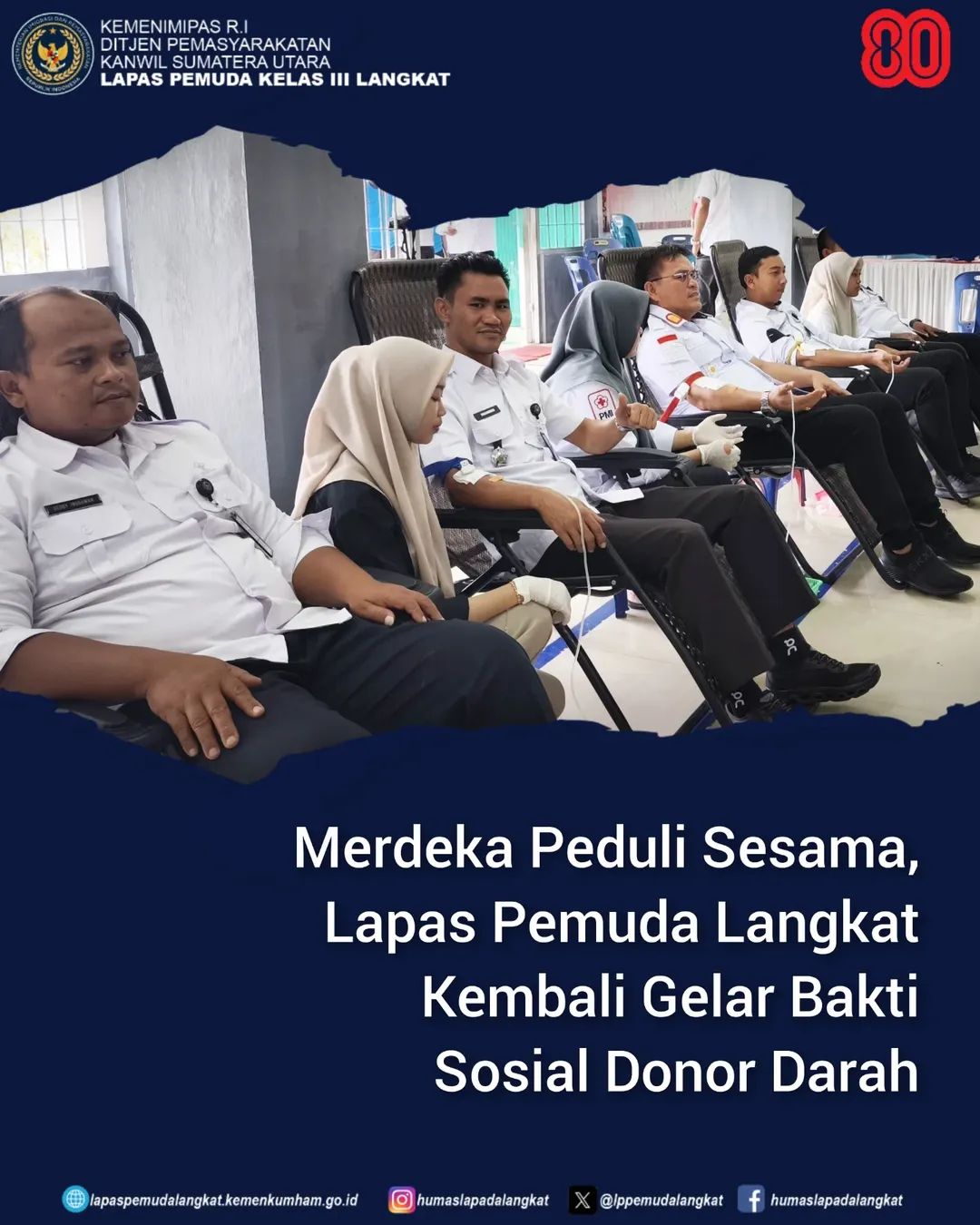 “Masih di momen-momen peringatan Hari Ulang Tahun Republik Indonesia Ke-80 ini seluruh jajaran Lapas Pemuda Langkat gelar bakti sosial Donor darah karena ini adalah salah satu bentuk kepedulian yang sangat penting dalam menyelamatkan nyawa orang lain. Melalui kegiatan ini, Lapas Pemuda Langkat tidak hanya memberikan kontribusi nyata bermanfaat bagi masyarakat, tetapi juga mewujudkan nilai-nilai kemanusiaan.” Pungkasnya