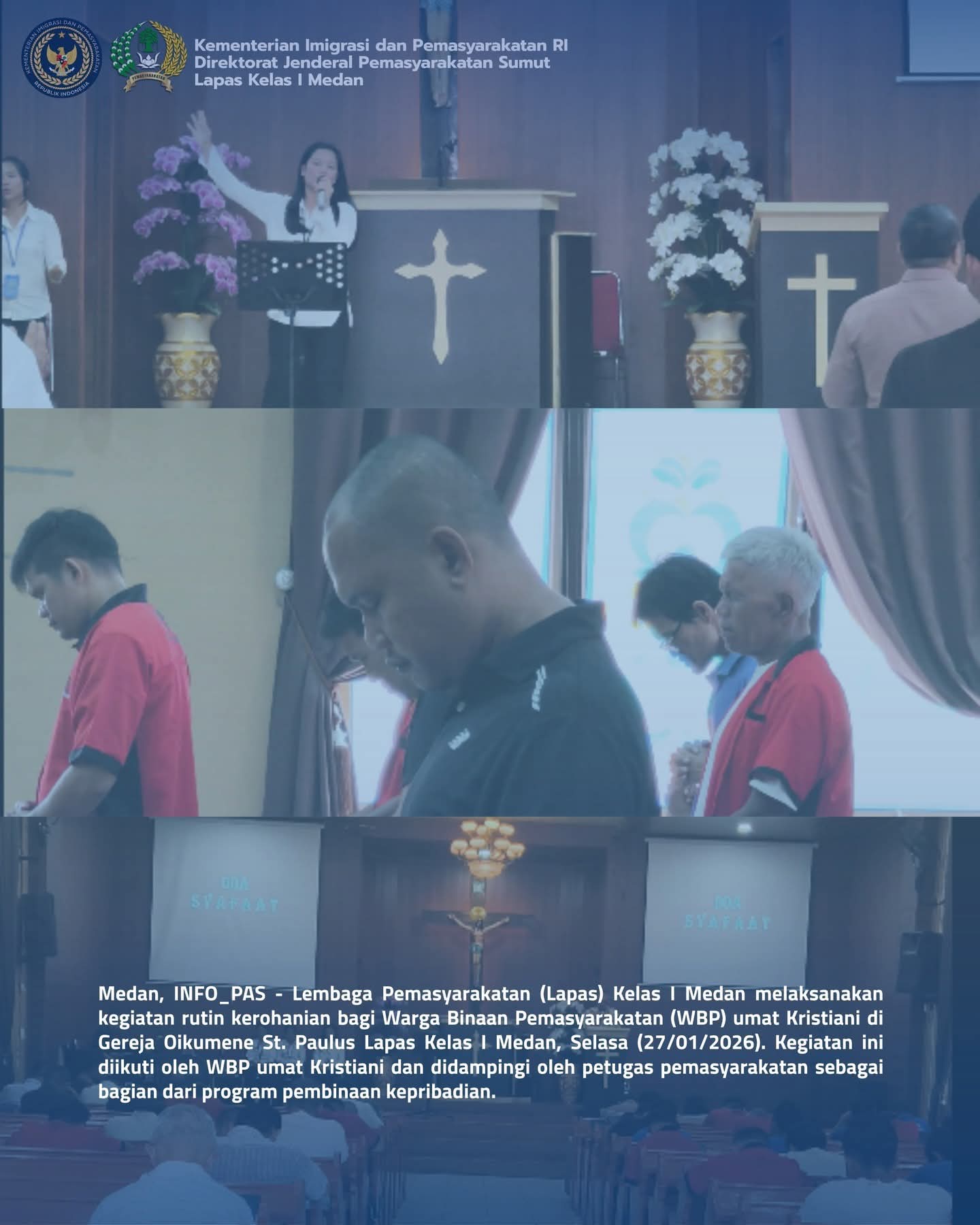MEDAN | TURNBACKHOAX.NET -Lembaga Pemasyarakatan (Lapas) Kelas I Medan melaksanakan kegiatan rutin kerohanian bagi Warga Binaan Pemasyarakatan (WBP) umat Kristiani di Gereja Oikumene St. Paulus Lapas Kelas I Medan, Selasa (27/01/2026). Kegiatan ini diikuti oleh WBP umat Kristiani dan didampingi oleh petugas pemasyarakatan sebagai bagian dari program pembinaan kepribadian.