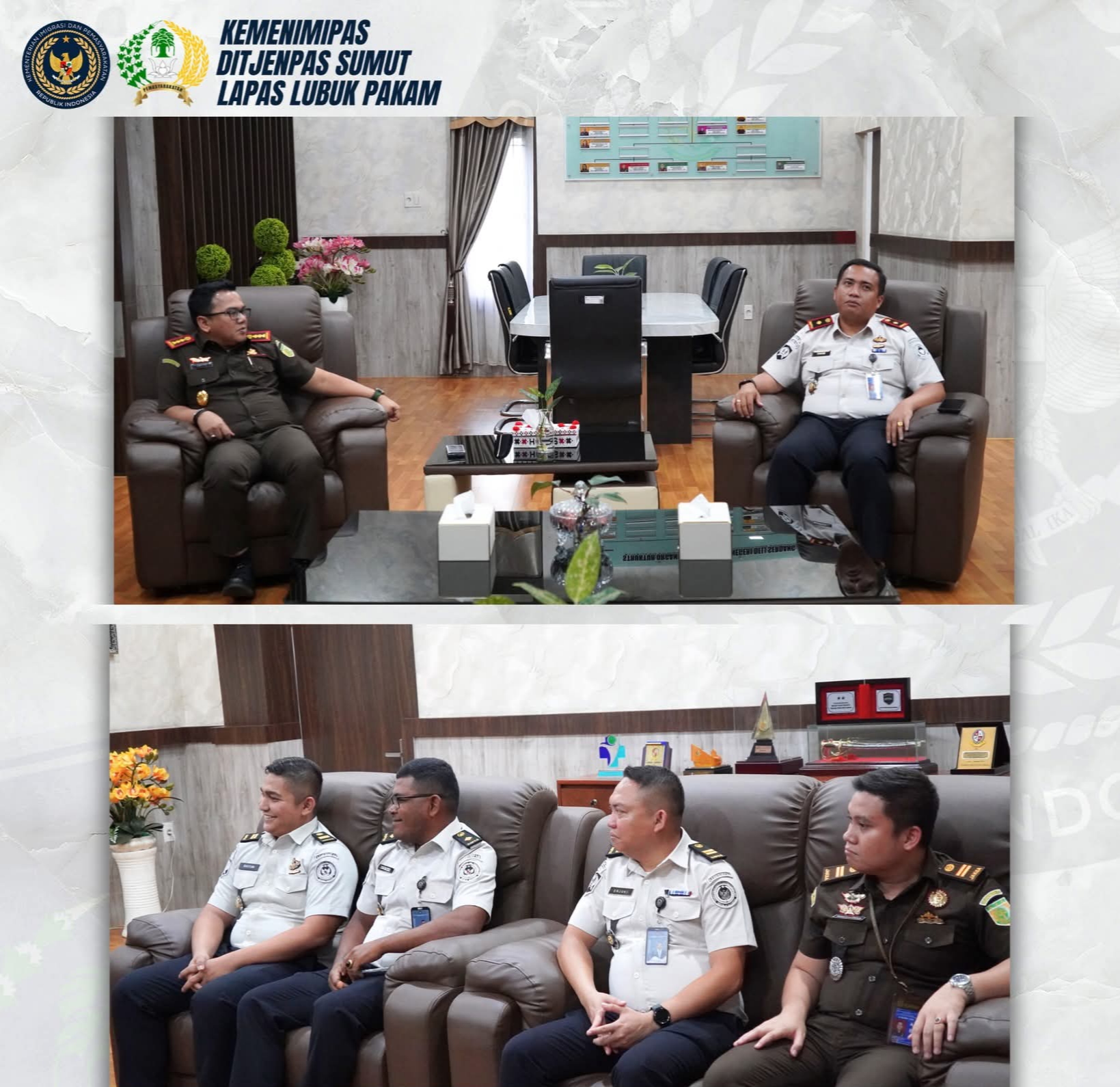 Kunjungan resmi ke Kejaksaan Negeri Deli Serdang dalam rangka pemberian piagam penghargaan atas pendampingan hukum (Legal Assistance) Jaksa Pengacara Negara terhadap Pengadaan Pekerjaan Konstruksi Kegiatan Pembangunan Tembok Antar Bangunan, Pagar Pembatas Area, serta Sarana dan Prasarana Lingkungan pada Lapas Lubuk Pakam. Kegiatan ini dipimpin oleh Kalapas Lubuk Pakam, Hakim Sanjaya yang didampingi oleh Kasubag TU, Yanto Simanjuntak; Kasi Binadik & Giatja, Bastian Surya Manik serta Kasubsi Registrasi dan Bimkemas, Erjuki Naibaho.